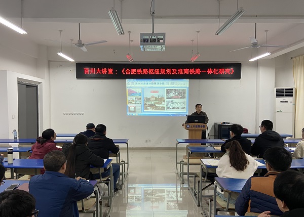12月10日上午,土木建筑学院邀请我校兼职教授、82届优秀校友贾可教授级高工在求是楼南227会议室为母校师生作题为《合肥(及淮南)铁路枢纽规划展望》的报告。学术报告会由学院党委书记徐冬生主持,学院专业课教师、学生代表140余人聆听了报告。