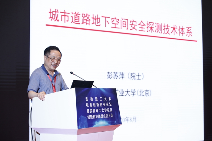 随后举行了院士报告会,报告会由王运敏院士主持 。彭苏萍院士围绕《城市道路地下空间安全探测技术体系》专题研究,从城市道路及地下空间安全风险分析、探地雷达装备及创新技术、技术优势及应用案例、构建城市道路及地下空间安全技术体系四个方面作了深入的讲解。袁亮院士以《合肥综合性国家科学中心助力安徽理工大学创新发展》为题,从国家科学中心是科技创新的“制高点”、安徽理工大学是创新发展的“方面军”、安徽理工大学是中心建设的“先锋队”、构建长三角一体化协同创新“朋友圈”四个方面作了热情洋溢的阐释。他指出,学校比历史上任何时期都更接近、更有信心和能力实现“创建世界一流学科和国内一流特色高水平大学”目标。学校将继续大力支持校友工作,积极服务校友发展,做好广大校友的坚强后盾!他希望广大校友进一步深化感情,增进合作,进一步融入学校发展,为共同创建“双一流”奋斗,为实现民族复兴作出新的贡献!常进院士通过线上方式向论坛的召开表示祝贺,他对“安徽理工大学南京智慧物联研究院”的前景充满期待并祝愿我校在“双一流”创建中不断取得新的突破!陈湘生院士线上分享《打造城市安全基石——建设超大韧性城市(群)之思考》专题研究,他介绍了中国和世界超大城市群的分布,分析了超大城市群所面临的主要风险,提出实现超大韧性城市群的技术路径,倡导打造超大城市(群)“空、海、地”全覆盖一体化安全智能平台,提升人民群众幸福感。