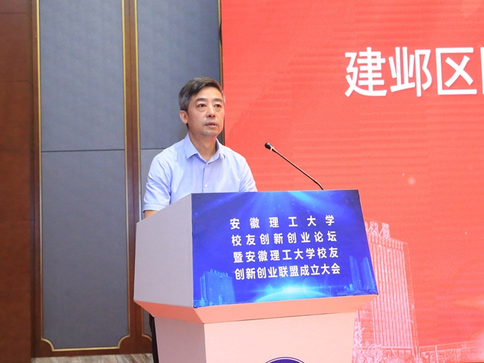 刘玉民致辞。他全面介绍了建邺区在南京的发展定位、地标产业、创新创业扶持及营商环境方面的区位优势。他表示,安徽理工大学校友会抢抓机遇、选择南京、携手建邺,共建南京智慧物联研究院新型研发机构,入驻南京海外校友创新服务中心,必将进一步深化校地产学研融合,用好校友资源的“金矿”,挖掘科研成果的“富矿”,为建邺乃至南京的高质量发展注入新的活力。他诚挚邀请安徽理工大学校友把建邺区作为事业崭新起点、作为投资兴业首选之地,在建邺成就人生梦想,与建邺共创美好未来。安徽理工大学的校园精神是“志存高远、追求卓越、求真务实”,而建邺精神则是“追求卓越、勇争一流”,相信双方“追求卓越”这一共同目标,必将成为诠释本次合作的最佳注脚!