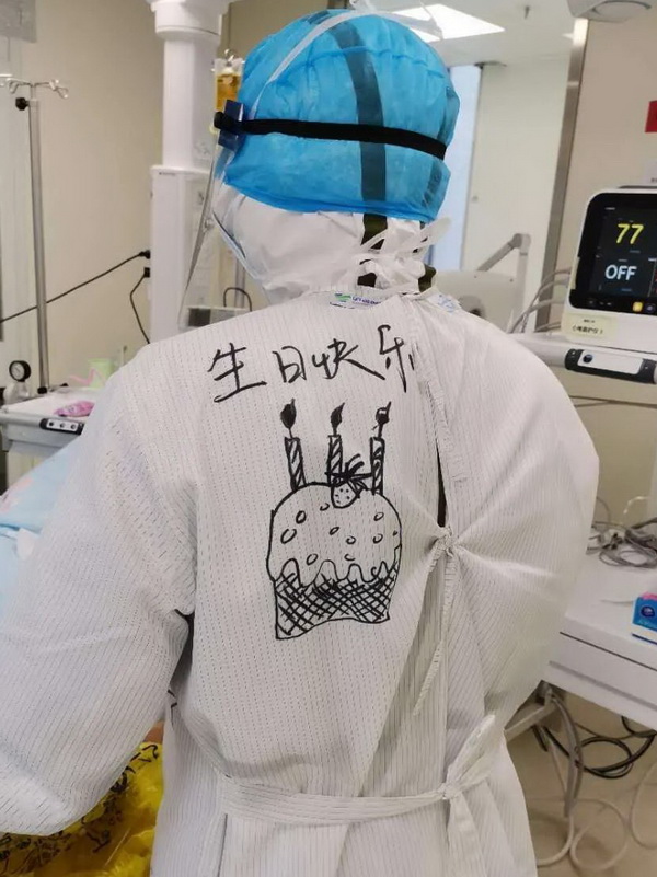 3月5日,是程仁洪医生出战泰康同济医院的第21天了,也是他的小女儿优优的生日,这天他特意在防护服上写上“优宝贝2岁了,爸爸祝你生日快乐!”的字样,等到处理完所有危重患者,并与接班医生交接清楚以后,在临下班前特意让科室同事帮忙给自己拍些照片,录个生日祝福视频给女儿当生日礼物。他说,他想看看把自己变成“大白”的样子给女儿唱生日歌,女儿还能不能认出他?在这个特殊的监护病房里给女儿留一段视频,将会是女儿成长过程中收到的最有意义的一个生日礼物。