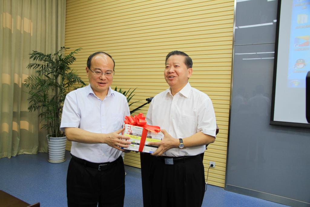在市校深度融合发展座谈会上,沈强代表淮南市向学校捐赠书刊,袁亮代表学校接受捐赠。