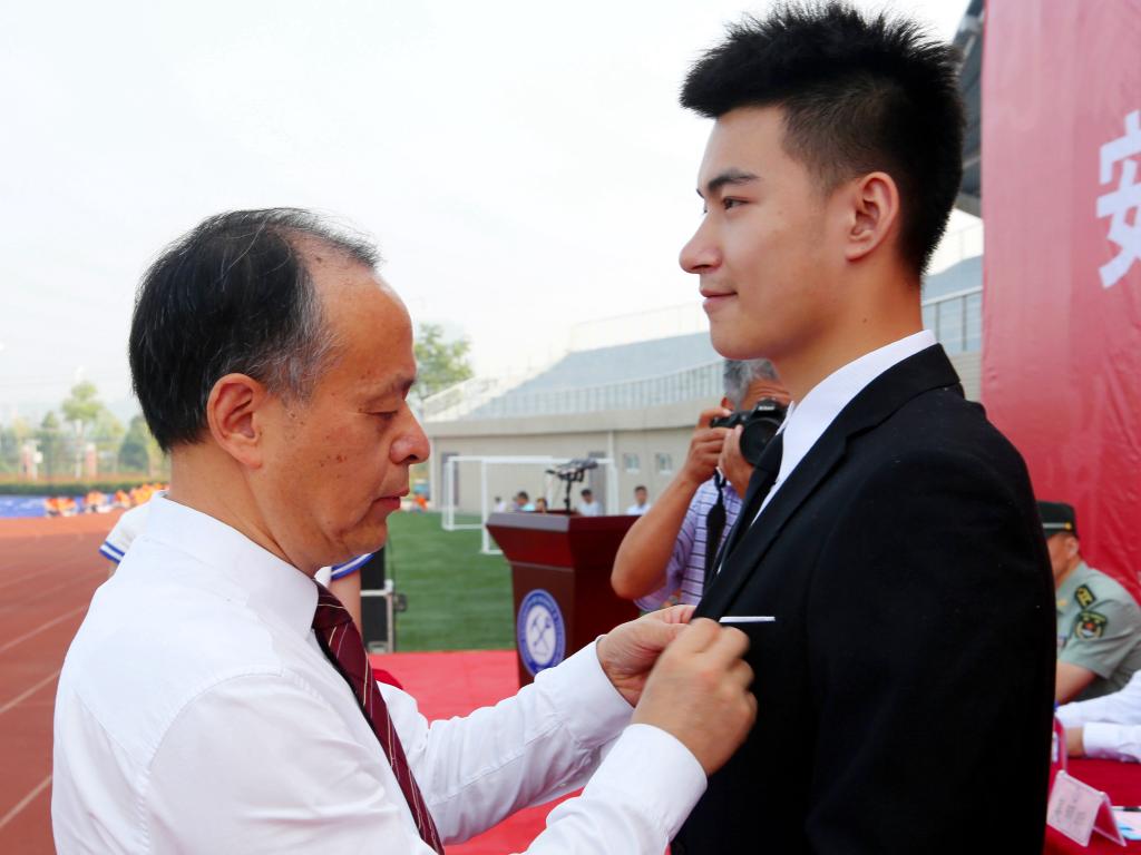 典礼上,郭永存为本科生新生代表和研究生新生代表佩戴了校徽。全场新生一同佩戴上了校徽。这一刻起,全体新生有了一个共同的光荣的名字“安理人”。