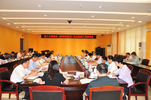 7月3日下午,全国人大常委会委员、省人大常委会副主任谢广祥率省人大执法检查组来淮开展高等教育法贯彻实施情况执法检查,听取淮南市政府及在淮高校负责人有关工作情况汇报并进行座谈,座谈会在舜耕苑二楼会议室举行。省委教育工委副书记庆承松陪同检查。市人大常委会主任陈儒江、副市长陆晞,校党委书记郭永存及在淮其他高校、市直有关部门负责人出席座谈会。