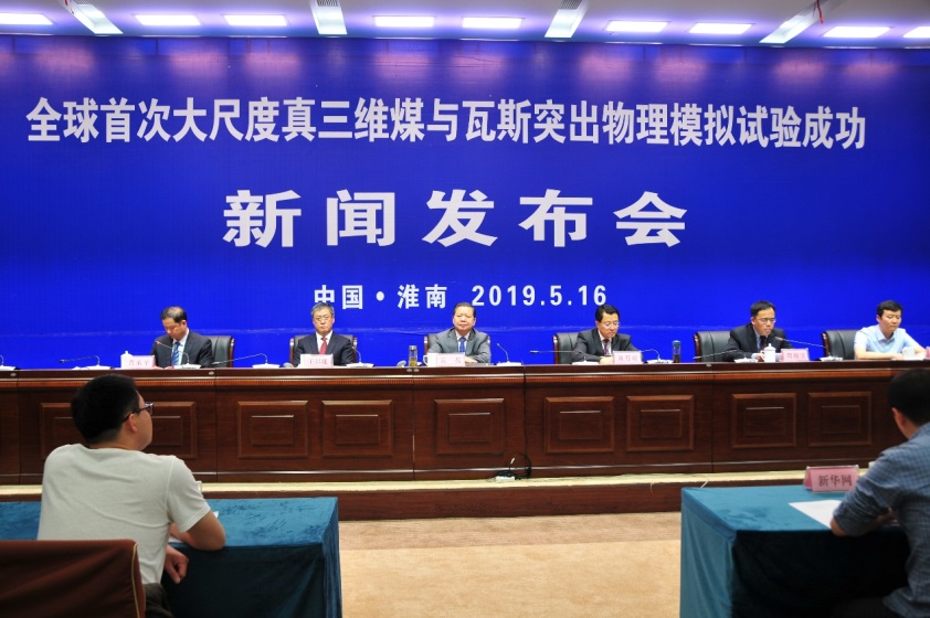 5月16日上午,全球首次大尺度真三维煤与瓦斯突出物理模拟试验成功新闻发布会在淮南市煤矿宾馆一号会议室举行。“用于揭示煤与瓦斯突出机理与规律的模拟试验仪器”国家重大科研仪器研制项目主持人,校党委副书记、校长袁亮院士宣布全球首次大尺度真三维煤与瓦斯突出物理模拟试验取得成功,并介绍了项目进展与成果,回答了记者提问。