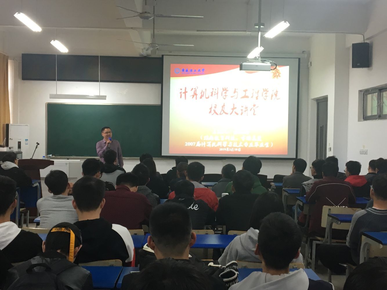 3月18日下午,计算机学院在求本楼B401举办校友大讲堂。计算机科学与技术专业07届校友、炫维教育科技市场总监房晓敏应邀作报告。2016级百余名学生听取了报告。