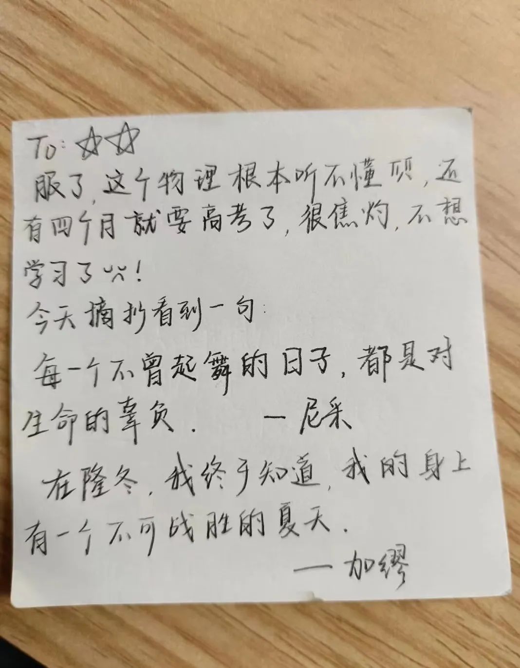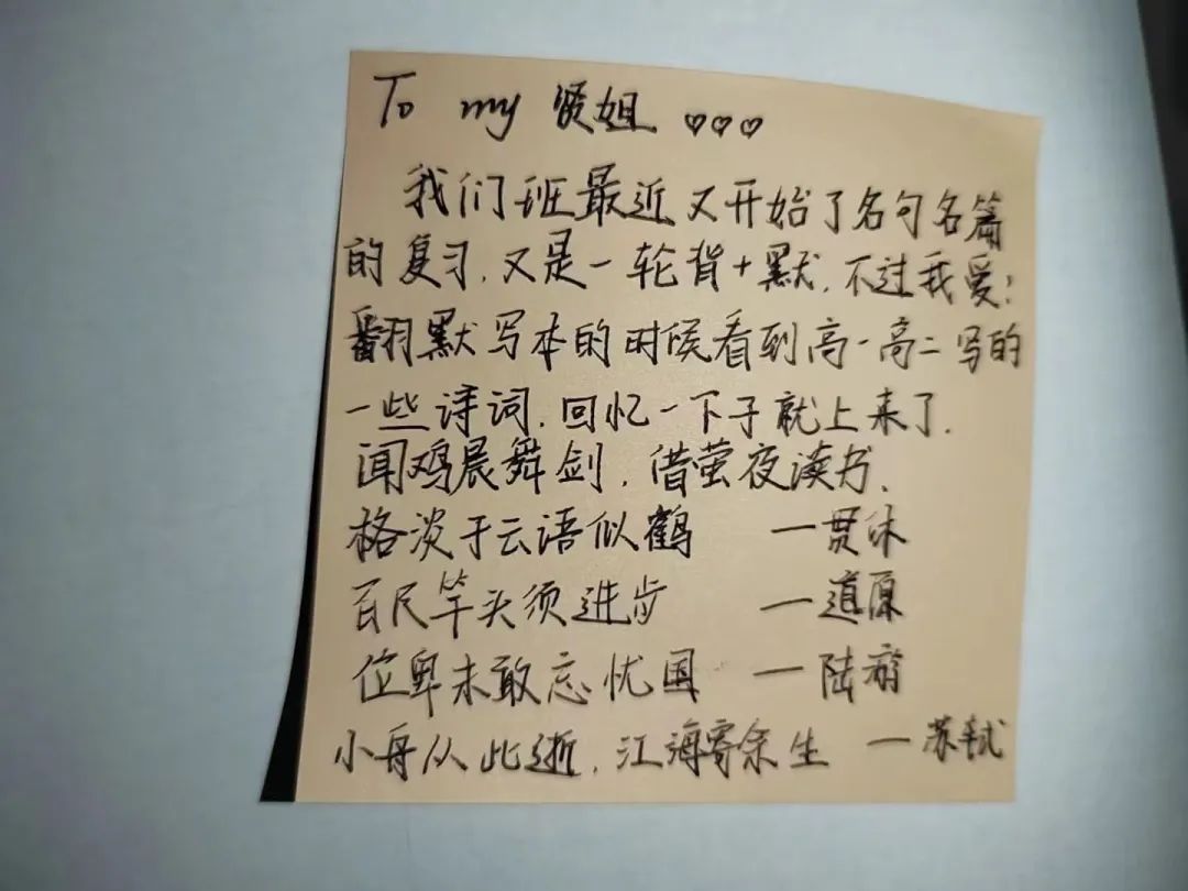 然而,成长的路途并非一帆风顺,跌跌撞撞才是常态。面对高三的学习压力,姐妹两既是对方的盔甲,又是彼此的港湾。一张张互相鼓励的小纸条,承载着青春的记忆与重量,这是姐妹俩传达心事的媒介。闲暇之余,她们就会把想说的话写到纸条上,到了约定好的时间来交换。“午休的时候,我偶尔也会把纸条贴在姐姐的桌子上。”蒋桂馨回忆道。而谈起纸条的内容,姐妹俩都笑了起来。对枯燥无趣的生活发一些牢骚、今天所遇到的一些小快乐、又或者是一个很小的八卦……分享欲从来没有随着时间的迁移从姐妹俩中间消退,相反地,它让两个女孩的心越贴越近。