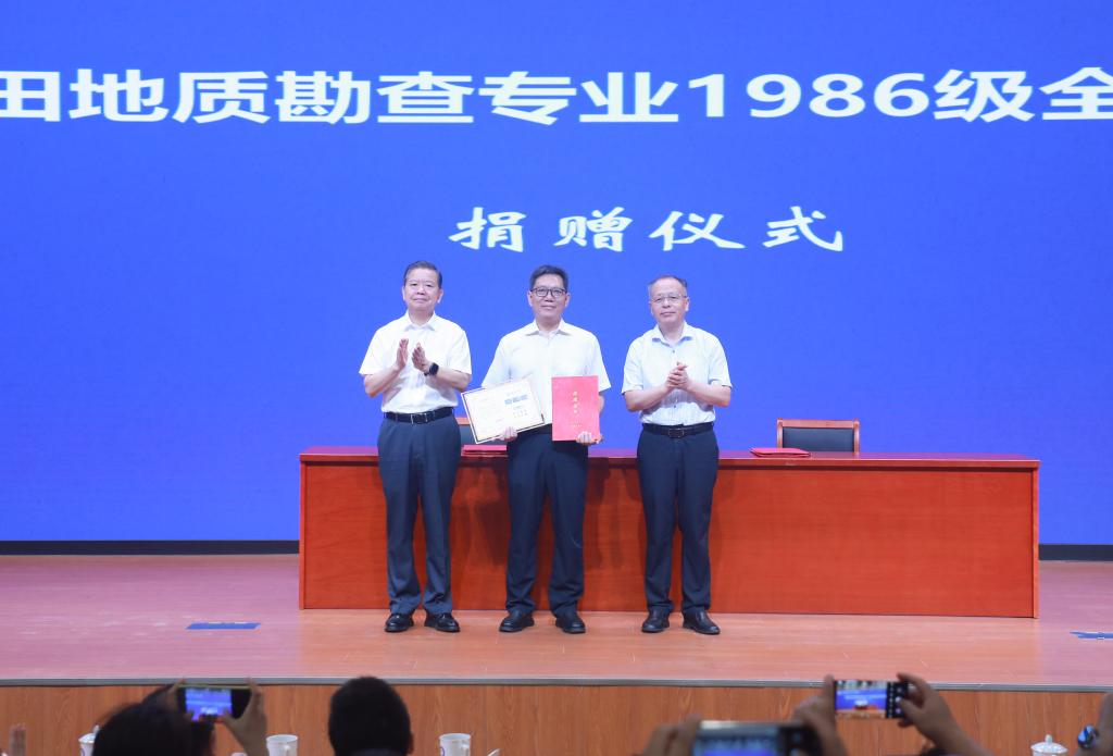 煤田地质勘查专业1986级校友何家齐、邹海、方志江、孟海涛、汪善梅、赵志根、饶孟余、熊恩龙,北京奥瑞安能源技术开发有限公司、上海申传电气股份有限公司嘉宾,学校内设机构主要负责同志,各学院校友会会长,以及地球与环境学院、电气与信息工程学院师生代表参加了捐赠仪式。